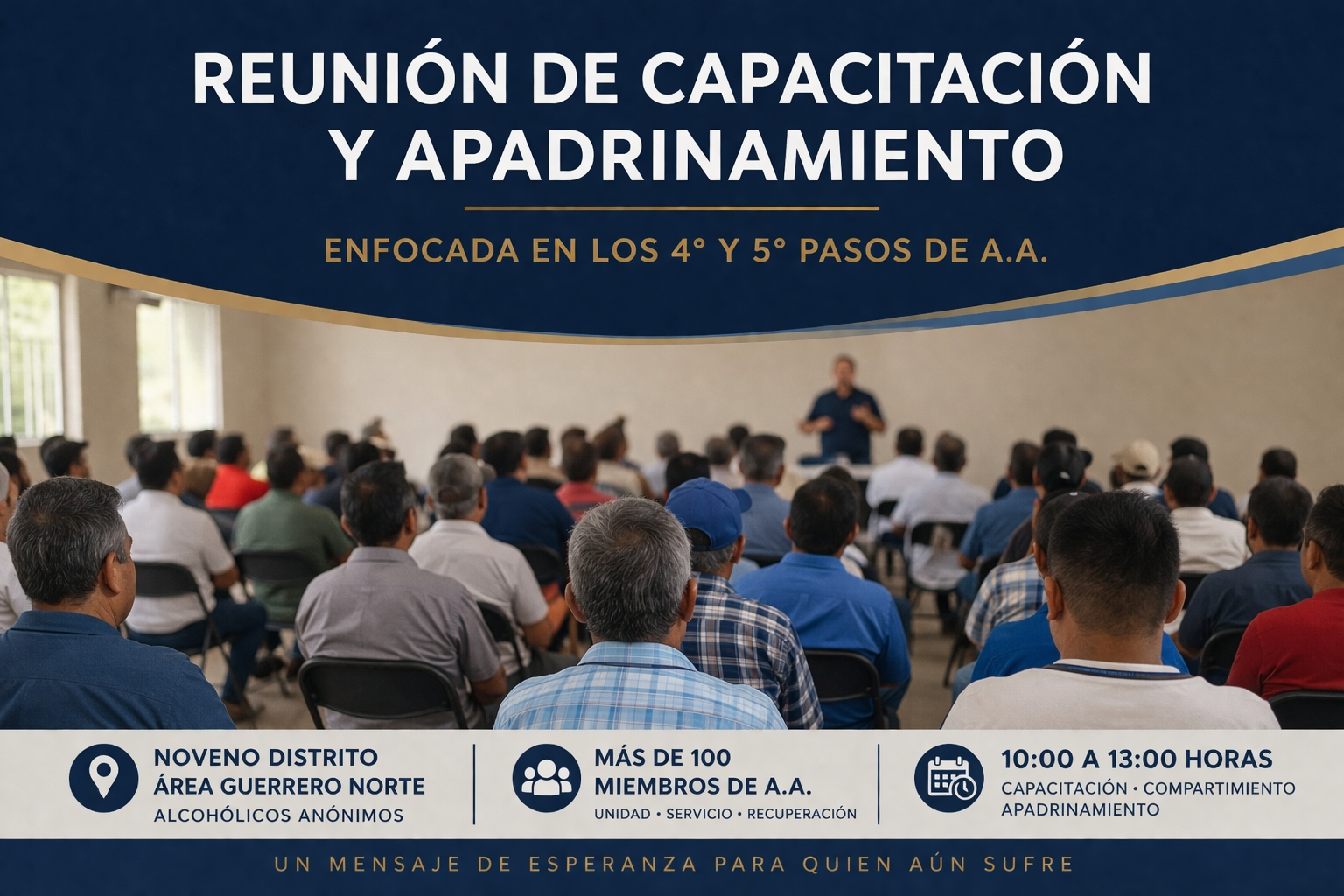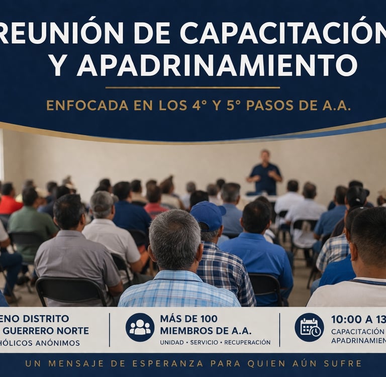 El Noveno Distrito fue sede de una Reunión de capacitación y apadrinamiento, enfocada en el estudio del 4° y 5° Pasos del programa de Alcohólicos Anónimos, basada en el texto “La guía para mi recuperación”, en la cual participaron más de 100 miembros de A.A.